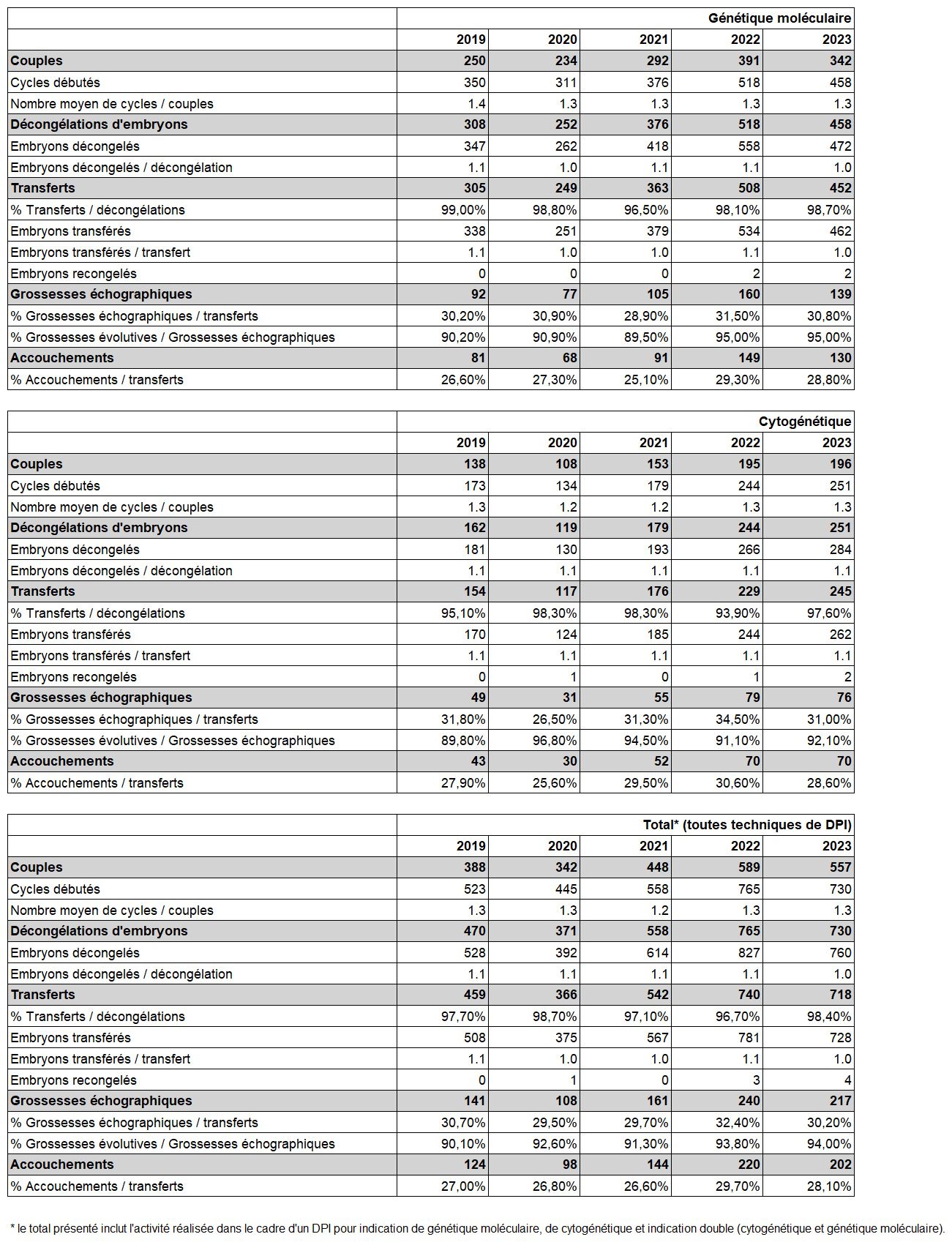 Considérant l’activité globale en 2023 (Tableau DPI10), 345 enfants sont nés vivants (issus de 334 accouchements) à la suite d’un DPI versus 369 enfants en 2022 (issus de 361 accouchements) soit une diminution de 6,5 % du nombre d’enfants nés vivants (-7,5% d’accouchements). Si l’on compare ces résultats à l’année 2019 (année précédant la crise sanitaire), le nombre d’enfants nés vivants augmente de +10,9 % (pour 311 enfants nés vivants en 2019).
