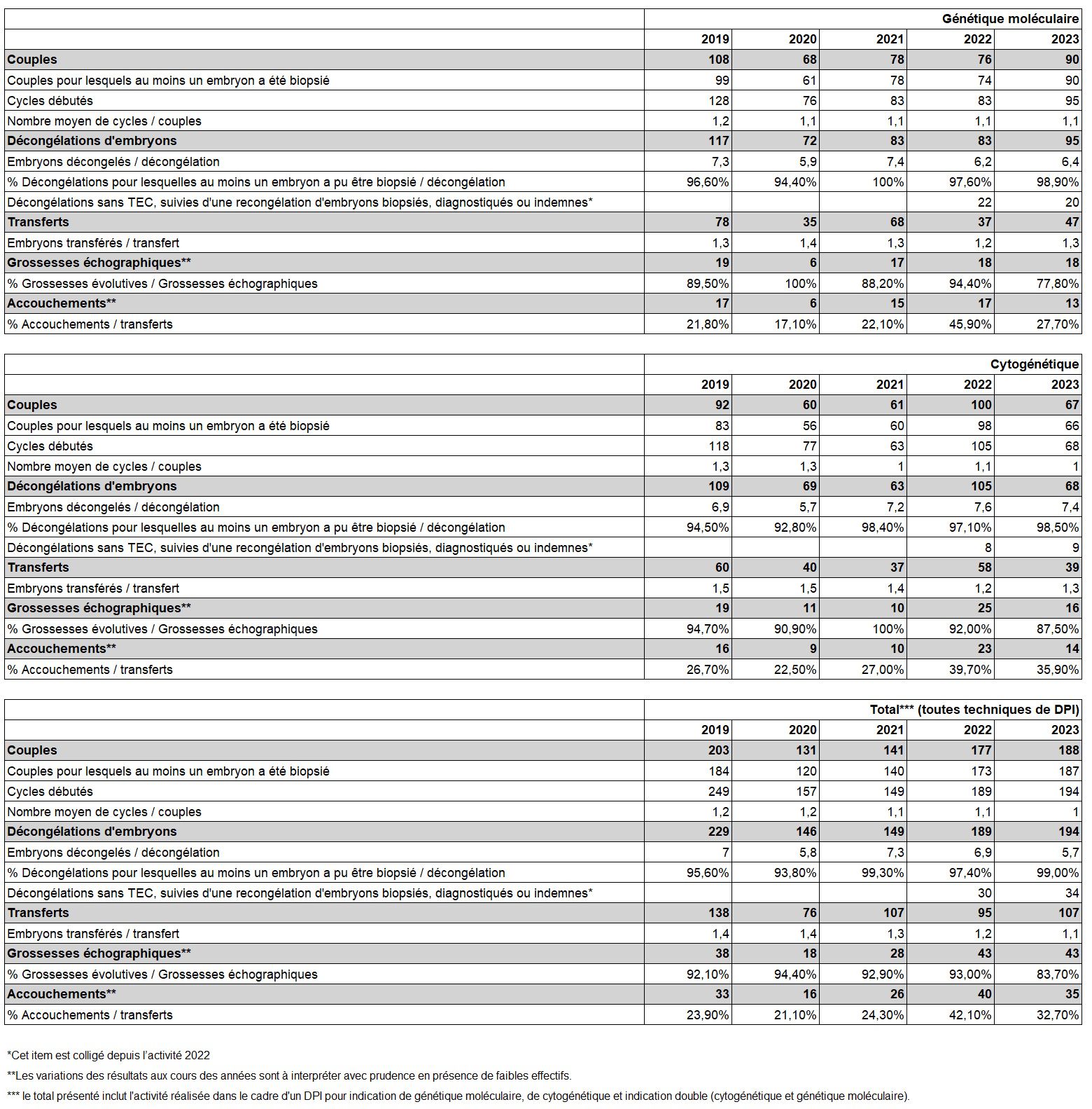 Cette pratique est principalement réalisée par 2 centres de DPI sur les 5 centres autorisés, une amélioration du recueil pourrait être envisagée afin de mieux évaluer cette pratique dans les centres de DPI.