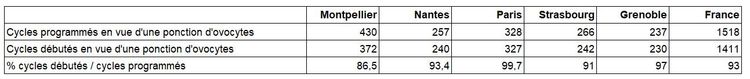 Tableau DPI13. Fréquence des cycles débutés en vue d'une ponction par rapport aux cycles programmés par centre en 2023