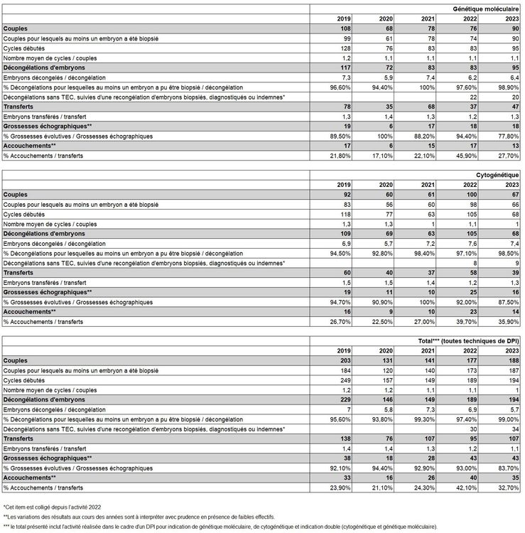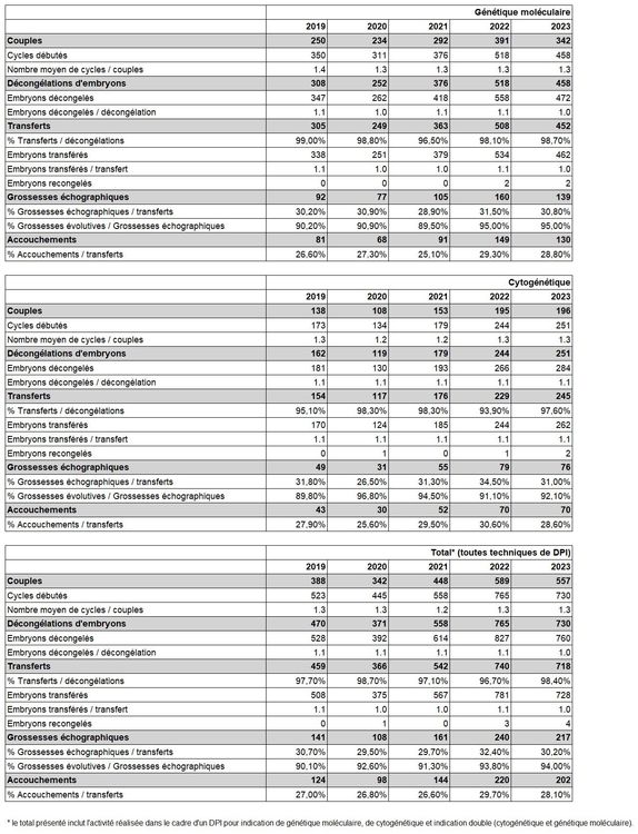 Tableau DPI19. Indicateurs de résultats d'AMP pour DPI en vue de transfert exclusif d'embryons congelés avant biopsie par technique en 2023
