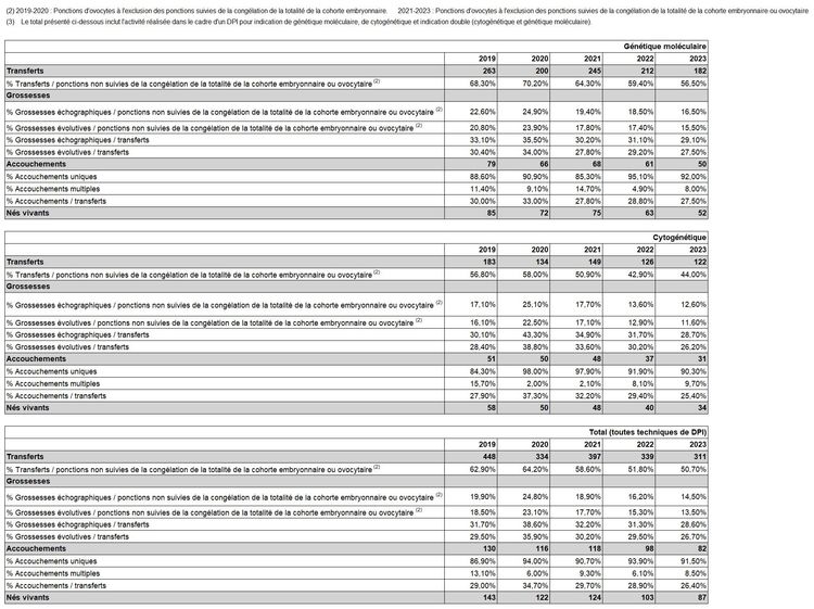 Tableau DPI15. Indicateurs de résultats d'AMP pour DPI avec transfert immédiat d'embryons ou transfert mixte (embryons frais et congelés) par technique en 2023