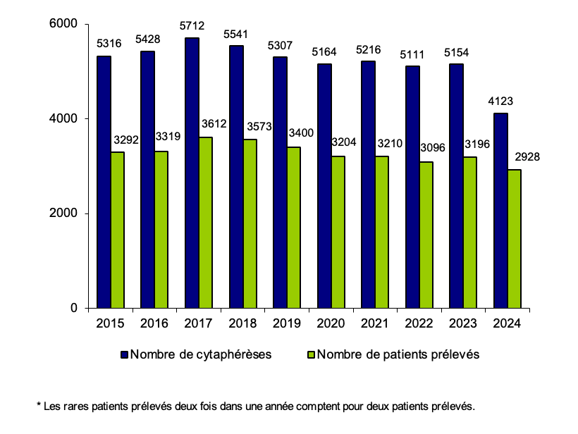 Le nombre de cytaphérèses par donneur diminue à 1,1 contre 1,3 en 2023.