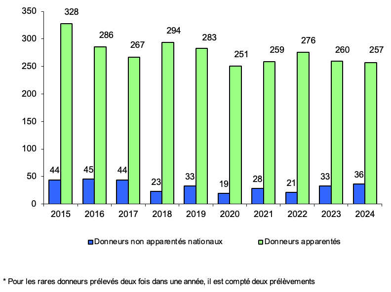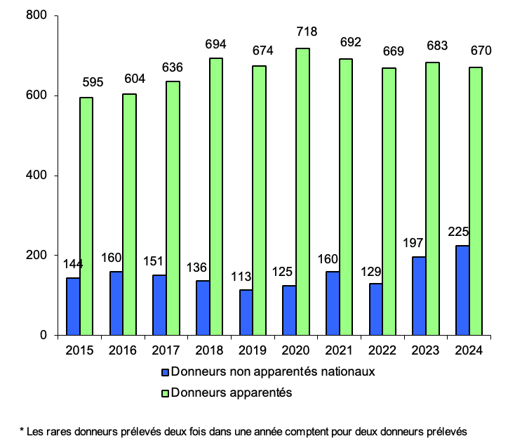 En 2024, ont été prélevés en CSP 225 donneurs nationaux non apparentés pour des patients nationaux ou internationaux et 670 donneurs apparentés (Tableau CSH P2, Figure CSH P3).