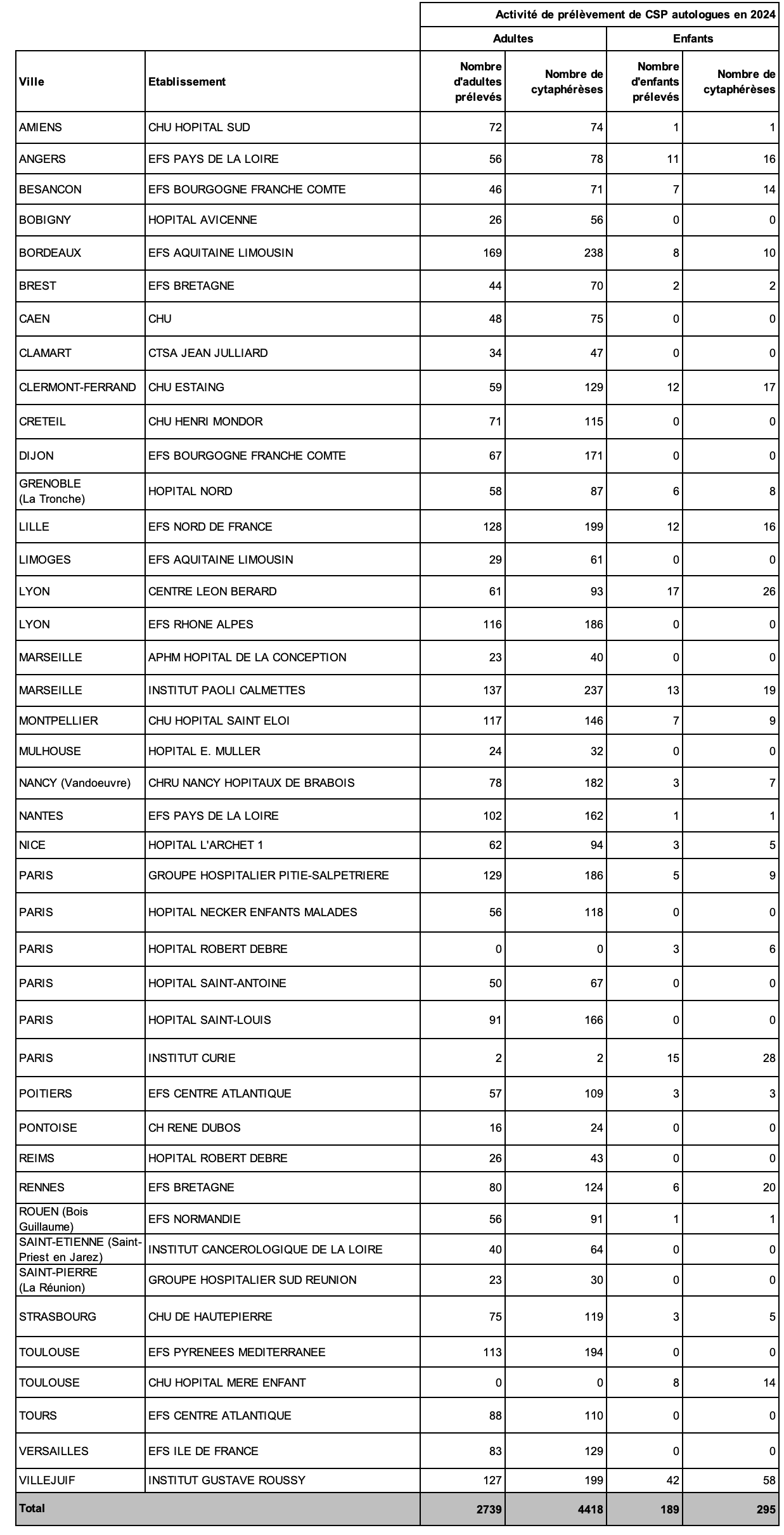 Concernant les prélèvements autologues de CSH réalisés en 2024, aucune comparaison n’a été effectuée avec le nombre de greffes autologues réalisées la même année, car les prélèvements autologues peuvent parfois être congelés plusieurs mois voire années avant d’être infusés.