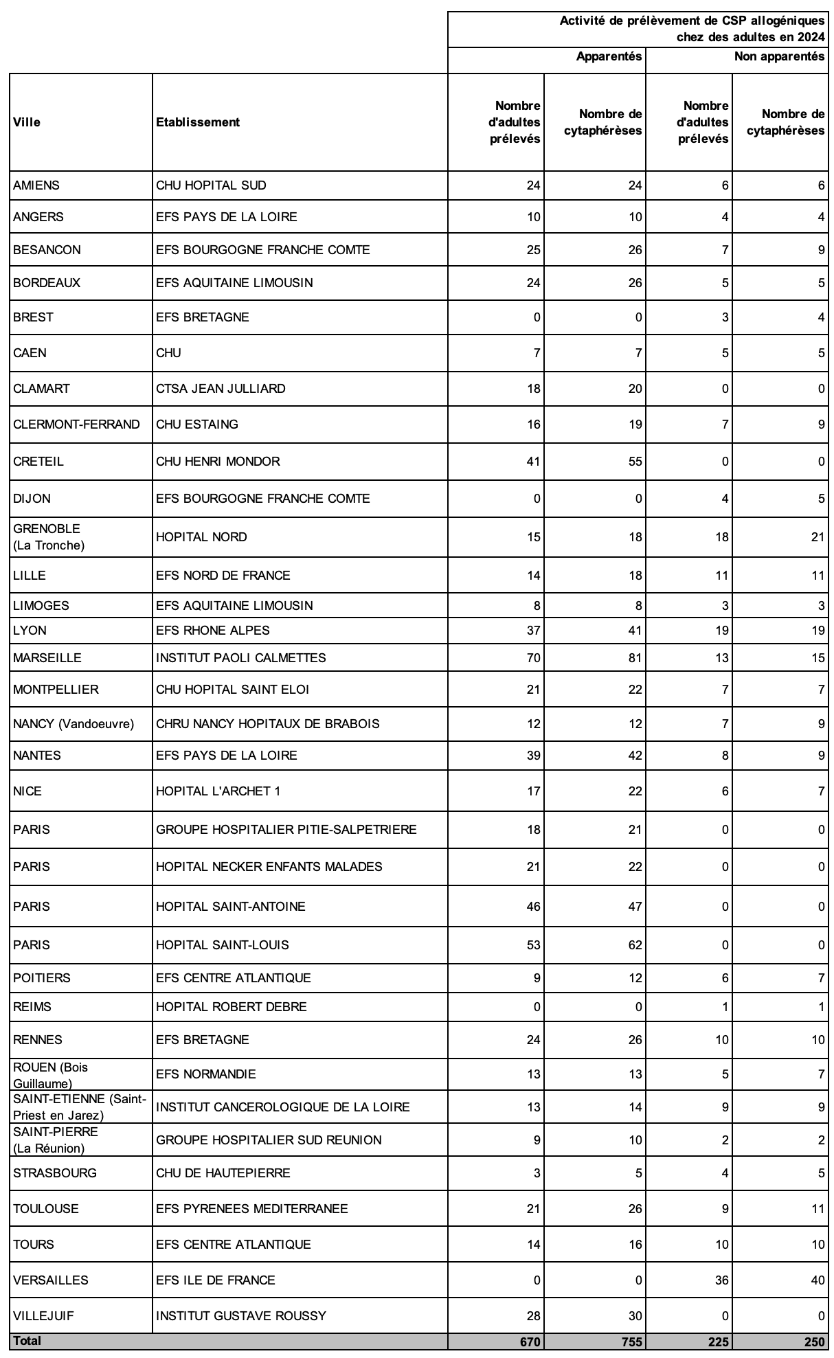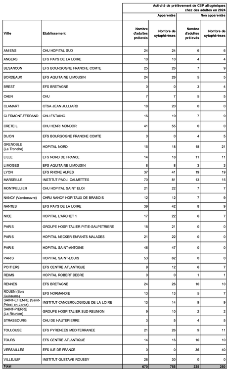 Tableau CSH P2. Activité de prélèvement de CSP allogéniques chez des adultes, par centre, en 2024