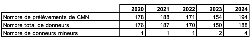 En 2024, parmi les 112 donneurs ayant reçu un avis favorable, 3 n’ont pas été prélevés (1 receveur décédé, 1 receveur en rechute, 1 refus de la greffe par le patient).
