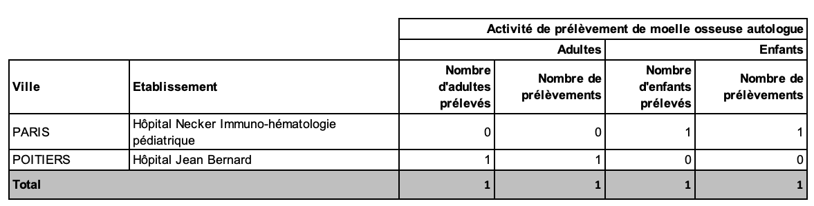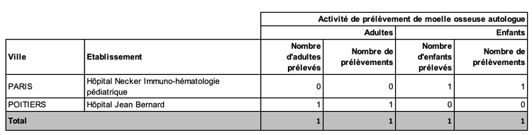 Parmi les 38 centres autorisés au prélèvement de moelle osseuse, seuls 2 centres ont eu une activité de prélèvement autologue en 2024 (Tableau CSH P6).