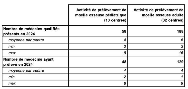 Les 32 centres ayant eu en 2024 une activité de prélèvement de moelle osseuse adulte totalisent 188 médecins formés pour le prélèvement de moelle osseuse et 129 médecins ayant effectivement prélevé en 2024, nombres stables par rapport à 2023 (Tableau CSH P8).