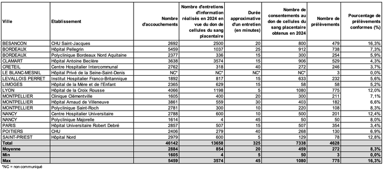 Le nombre de prélèvements de sang placentaire non apparentés déclaré par les maternités entre le 1er janvier et le 31 décembre 2024 a été comparé au nombre de prélèvements déclarés par les banques de sang placentaire au Réseau Français de Sang Placentaire pour la même période.
