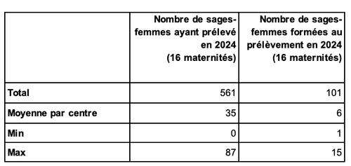 Les 16 maternités actives en 2024 ont toutes répondu au questionnaire de prélèvement de sang placentaire, sauf l’Hôpital Privé de la Seine Saint-Denis qui n’a réalisé que 3 prélèvements en 2024 (d’après la banque de Paris Saint-Louis).