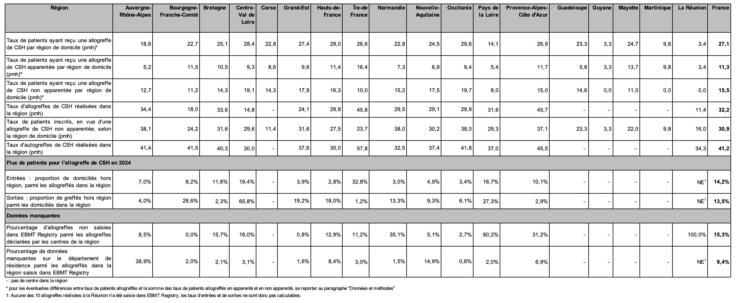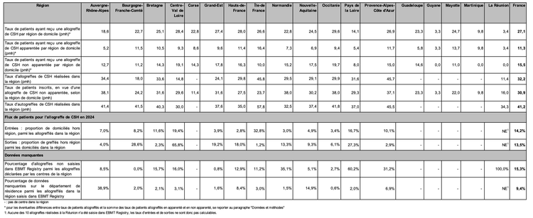 Les lignes 9 et 10 du Tableau CSH R1 donnent respectivement le taux d’allogreffes non saisies dans EBMT Registry et le taux de données manquantes sur le département de résidence du patient. Les résultats des régions ayant beaucoup d’allogreffes non saisies ou de départements de résidence manquants nécessiteront d’être interprétés avec prudence, concernant les indicateurs issus de la base EBMT Registry : taux de patients (global, apparentés, non apparentés) ayant reçu une allogreffe de CSH par région de domicile, flux de patients (taux d’entrées et de sorties). Les autres indicateurs, basés sur les déclarations des centres ou la base Syrenad, ne sont pas affectés par ces données manquantes.