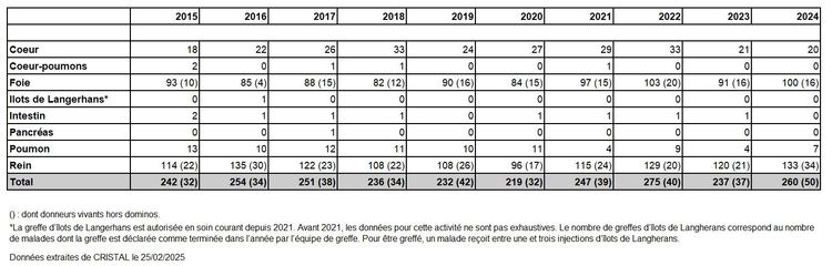 Les greffes d’organes réalisées le plus couramment sur des receveurs inscrits avant l’âge de 18 ans sont la greffe rénale (133 greffes en 2024) et la greffe hépatique (100 greffes en 2024).