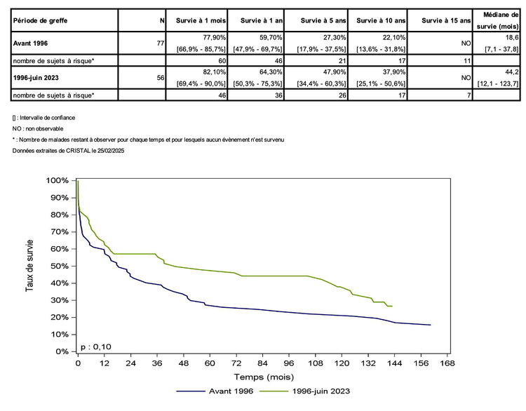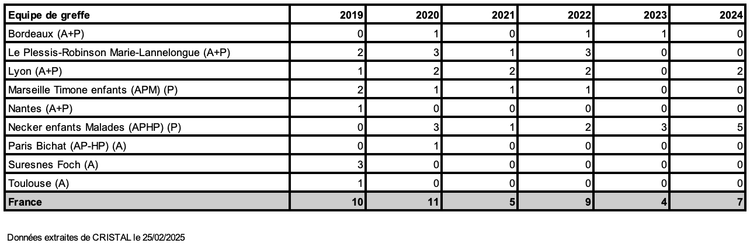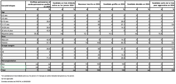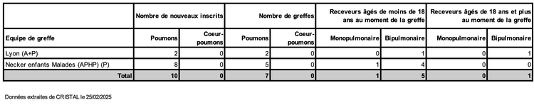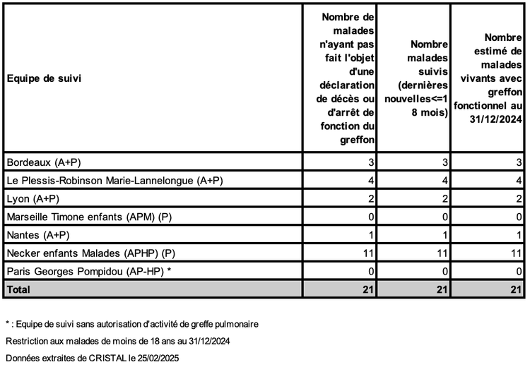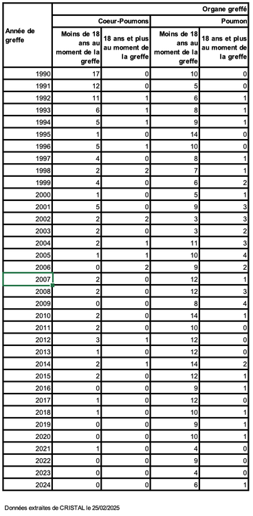 Depuis 1982, date de la première greffe cardio-pulmonaire, et 1987, date de la première greffe pulmonaire enregistrée dans Cristal, 125 greffes cardio-pulmonaires et 320 greffes de poumon ont été enregistrées chez des receveurs âgés de moins de 18 ans au moment de la greffe, ce qui représente l’expérience cumulée globale française en matière de greffe pulmonaire et cardio-pulmonaire pédiatrique. Sur l’ensemble du territoire national, au 31 décembre 2024, on estime à 2 le nombre de malades de moins de 18 ans porteurs d’un greffon cœur-poumons fonctionnel et à 21 celui des malades de moins de 18 ans porteurs d’un greffon pulmonaire fonctionnel.