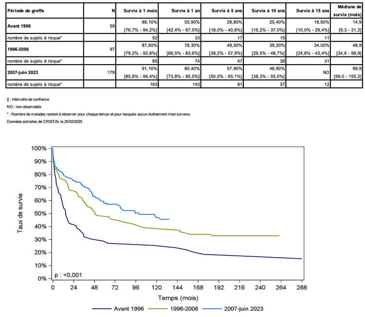 Figure PedPCP4. Courbes de survie du receveur pédiatrique après greffe cardio-pulmonaire selon la période de greffe (1987-juin 2023)