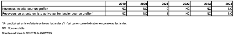 En 2024, il y a eu un prélèvement de greffon cardio-pulmonaire pédiatrique, greffé chez un adulte, aucune inscription en liste d’attente de greffe cardio-pulmonaire chez un enfant, ni aucune greffe cardio-pulmonaire pédiatrique.