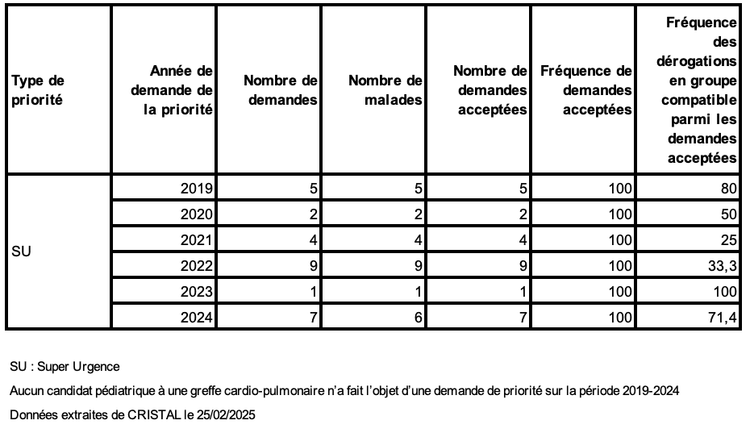 Tableau PedPCP9b. Evolution des demandes de priorité pulmonaire chez les candidats pédiatriques (2019-2024)