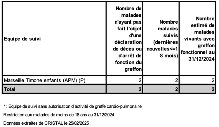 Tableau PedPCP16a. Estimation du nombre de malades porteurs d’un greffon cardio-pulmonaire fonctionnel au 31 décembre 2024, par équipe de suivi