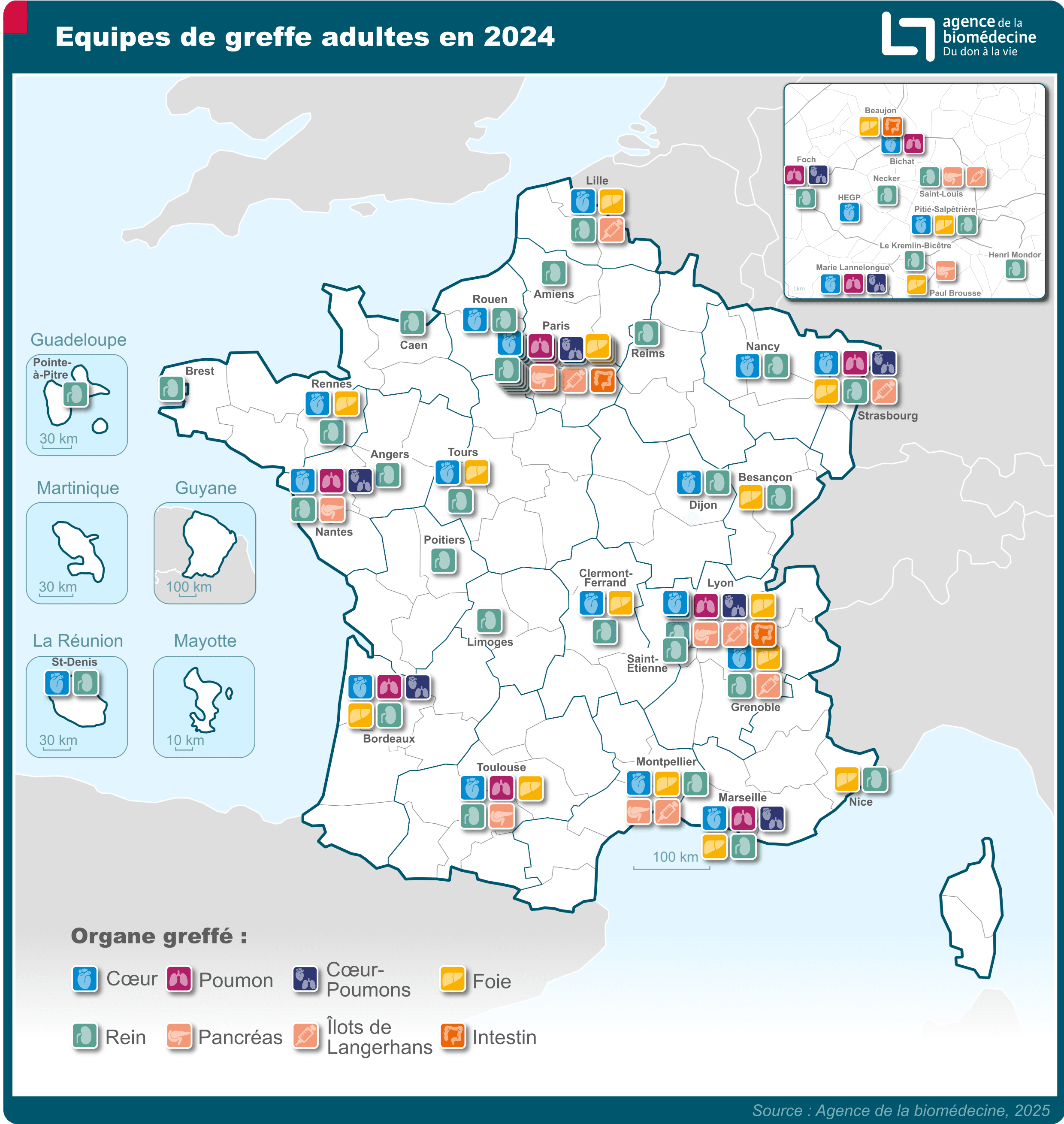 Figure G1. Répartition territoriale des équipes de greffe d’organes adultes