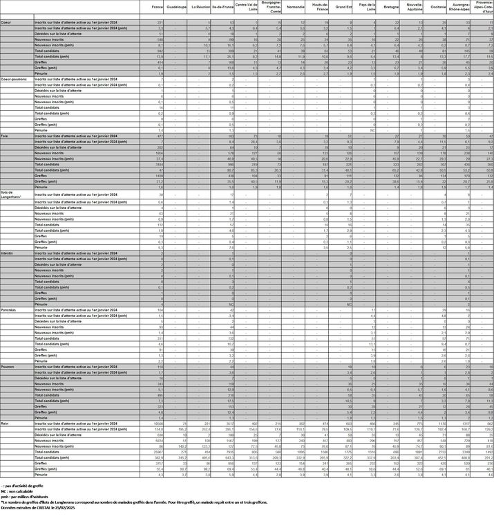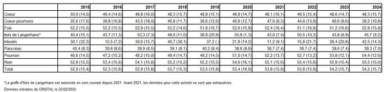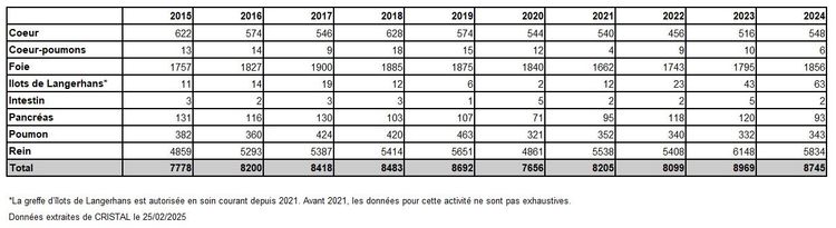 Ces chiffres sont présentés dans un tableau spécifique pour chaque organe.