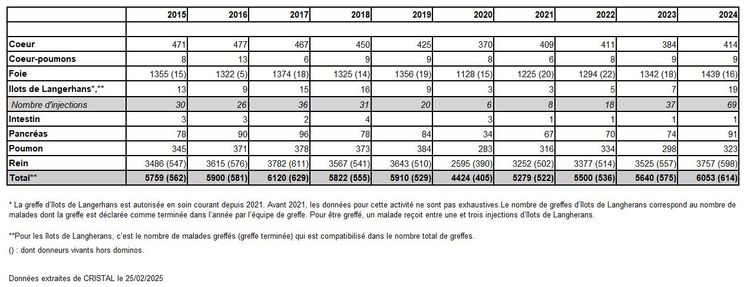 Le nombre de greffes peut être utilisé comme indicateur d'activité de greffe. L’activité de greffe d’organes en 2024 est égale à 6054 dont 614 à partir de donneurs vivants.