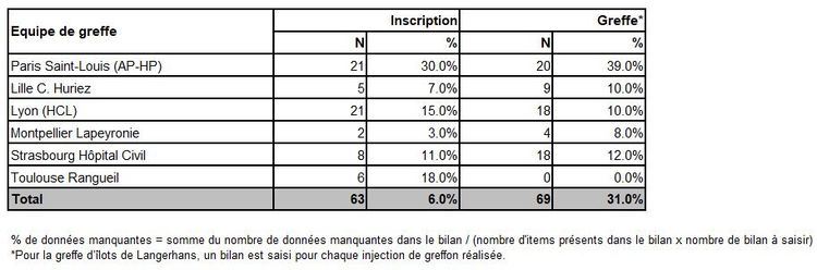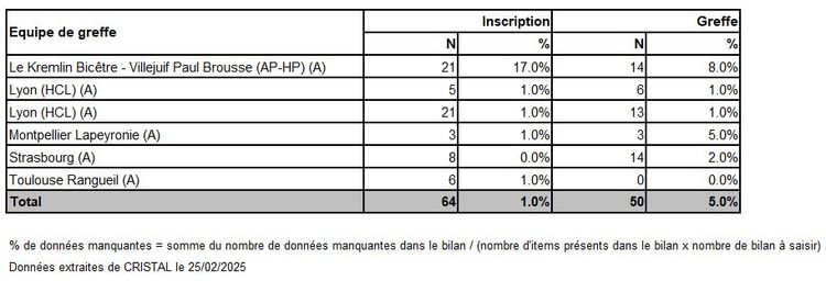 Dans le chapitre de greffe rénale, l’analyse de la non fonction primaire, de la reprise retardée de la fonction rénale et du débit de filtration estimé à 1 an se font en excluant les greffes des équipes qui ont plus de 30% de données manquantes pour ces indicateurs.