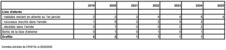 Une greffe intestinale a été réalisée en 2024 chez un receveur adulte (versus aucune en 2019 et 1 par an entre en 2021 et 2023), et 2 malades sont décédés en attente dans l’année, l’un d’eux en contre indication pendant toute la période d’attente.