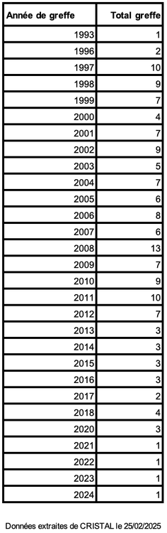 Parmi les 151 greffes réalisées entre 1993 et 2023, 37 étaient déclarées fonctionnelles aux dernières nouvelles (les dernières nouvelles datant de moins de 18 mois pour seulement 23 d’entre elles), 38 étaient déclarées en arrêt fonctionnel du greffon, 70 receveurs sont décédés et 6 receveurs ont été perdus de vue. Le nombre estimé de malades porteurs d’un greffon fonctionnel au 31 décembre 2024, calculé à partir des déclarations de suivi dans CRISTAL et des taux de survie du greffon mesurés sur la population globale, n’est que de 28 malades, dont 20 avec un suivi sur le site de Necker Enfants-Malades.