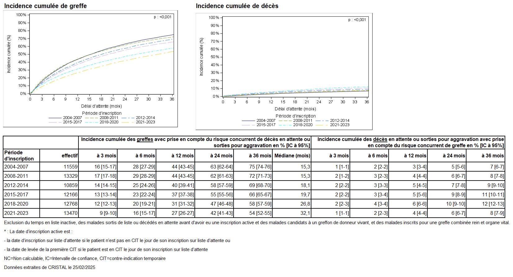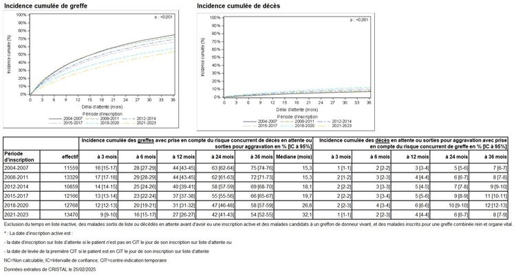 Figure R1. Taux d'incidence cumulée de greffe et de décès ou aggravation sur la liste d'attente de greffe rénale à partir de la date d’inscription active* selon la période