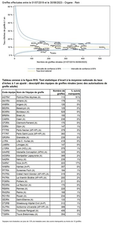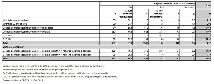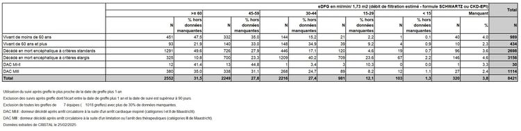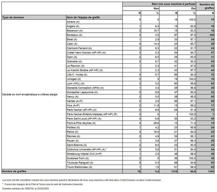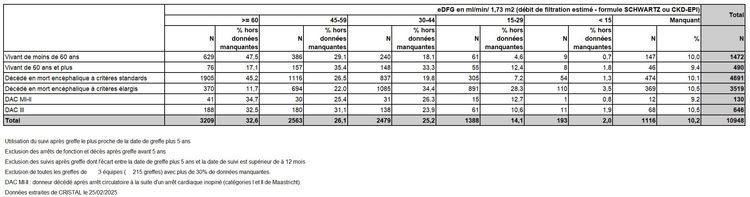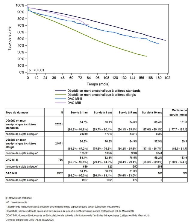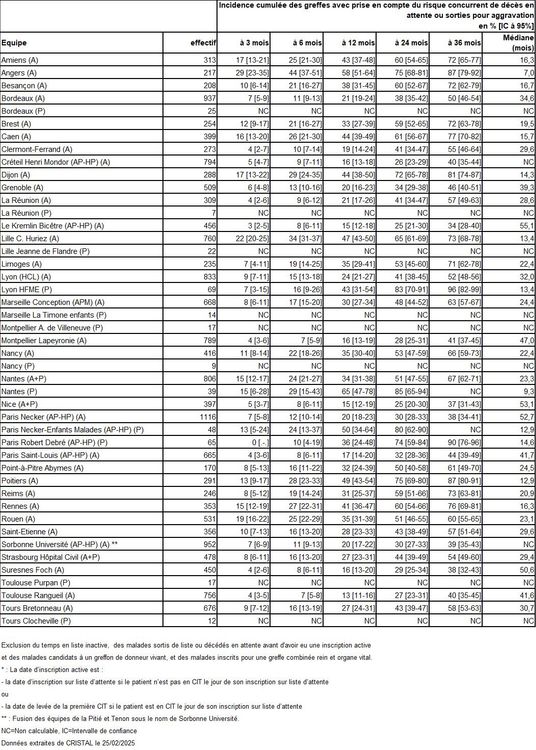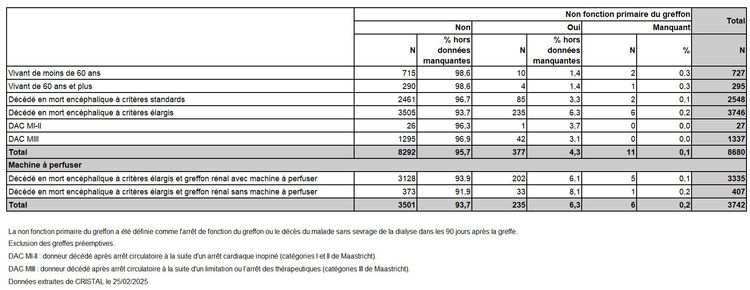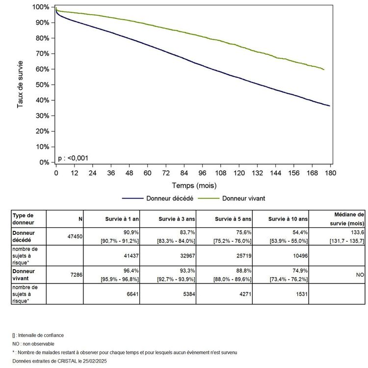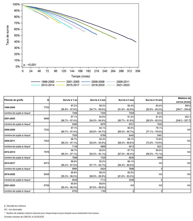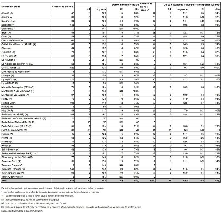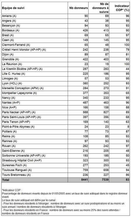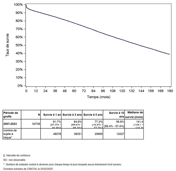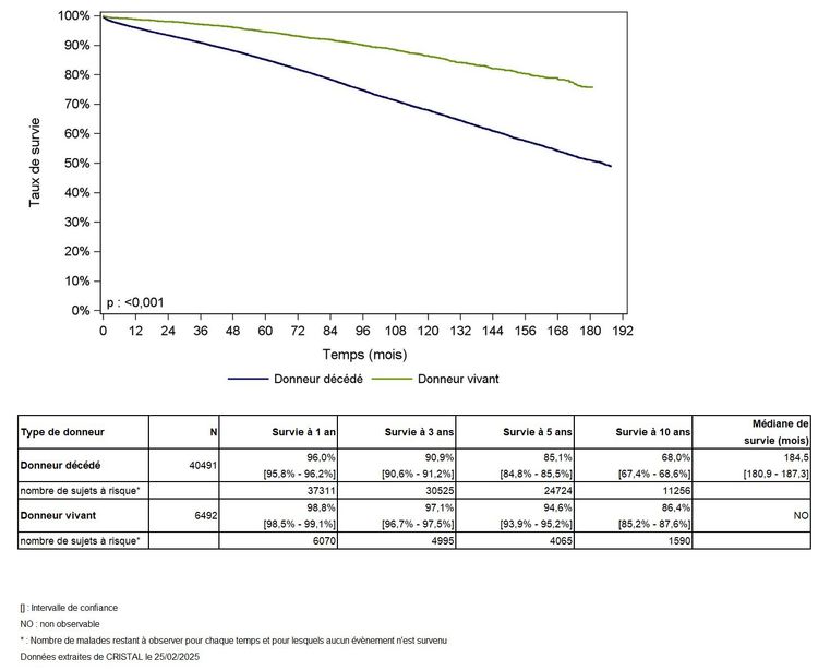 Les greffes suivantes sont exclues des analyses : greffes à partir de donneur vivant et de donneur décédé après arrêt circulatoire, greffes à partir de donneur étranger, greffes combinées, greffes effectuées par des équipes présentant 20% ou plus de perdus de vue.