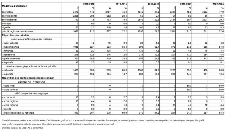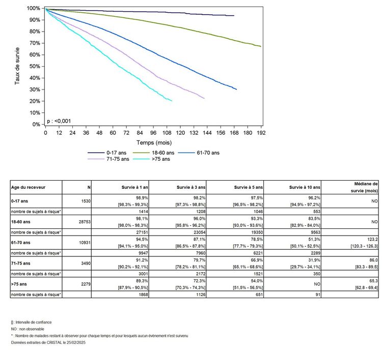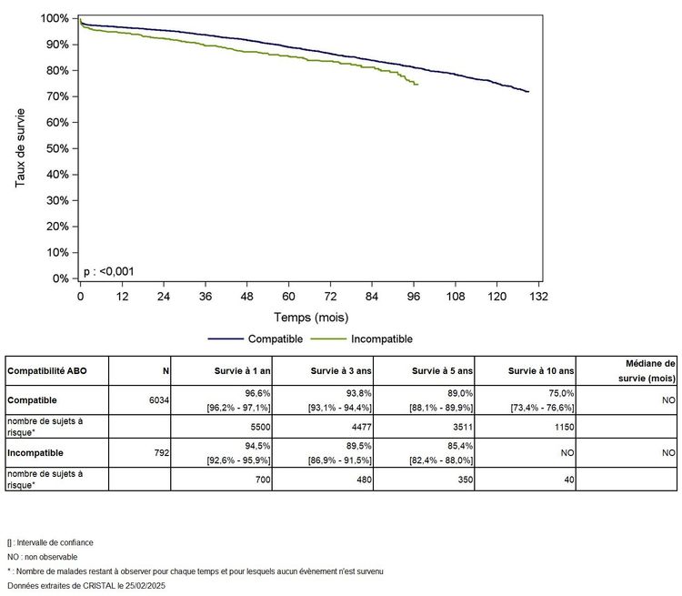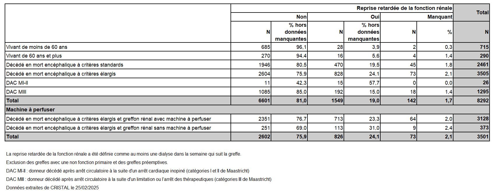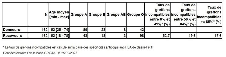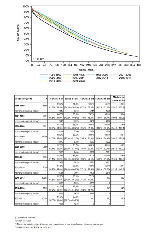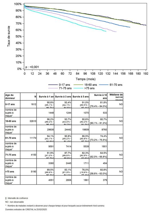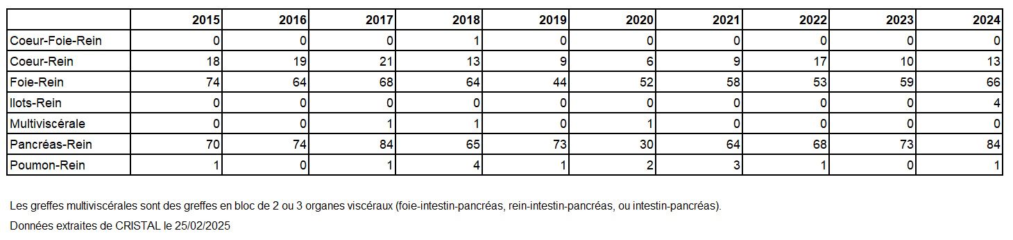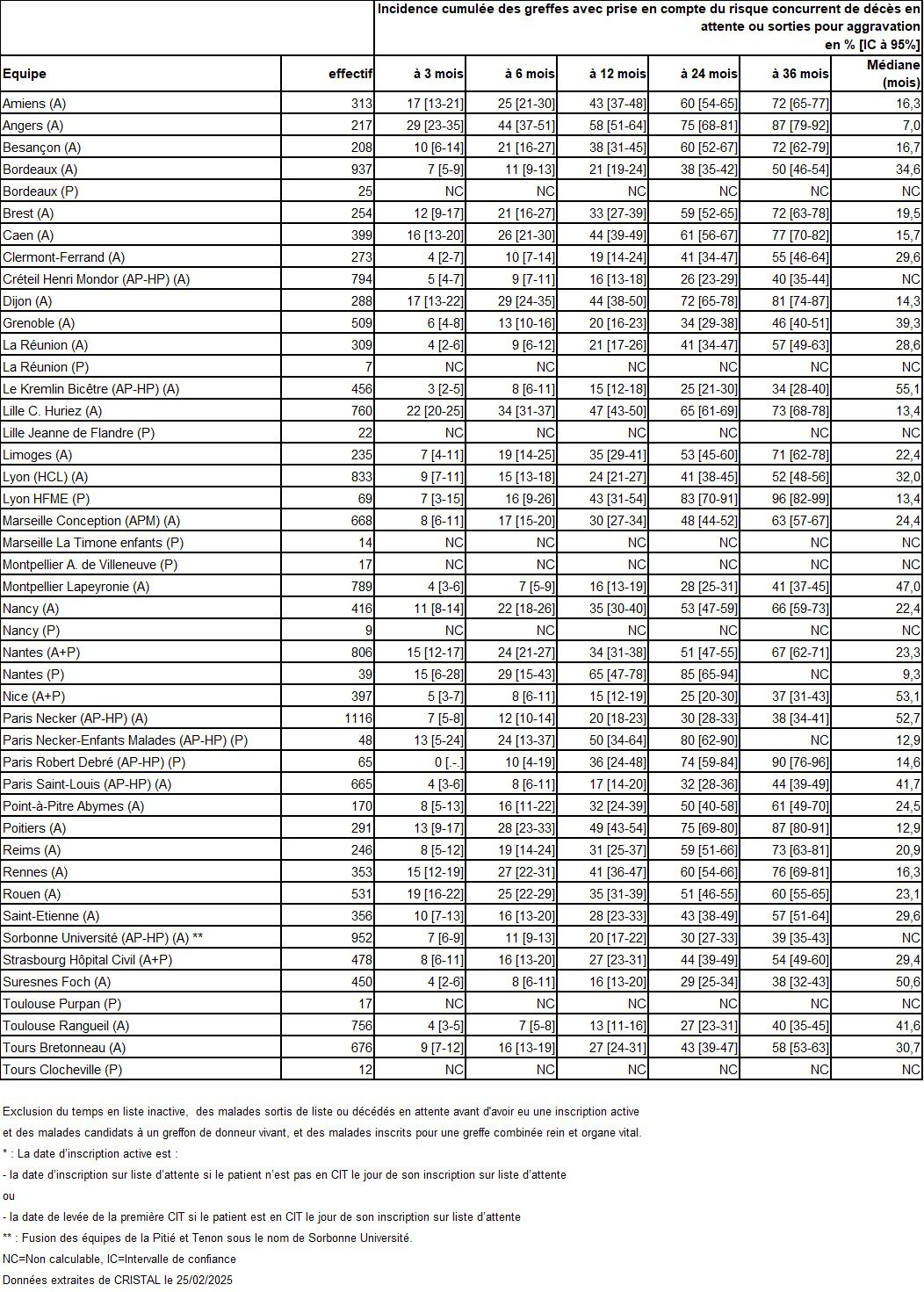 Les greffes suivantes sont exclues des analyses : greffes à partir de donneur vivant et de donneur décédé après arrêt circulatoire, greffes à partir de donneur étranger, greffes combinées, greffes effectuées par des équipes présentant 20% ou plus de perdus de vue.