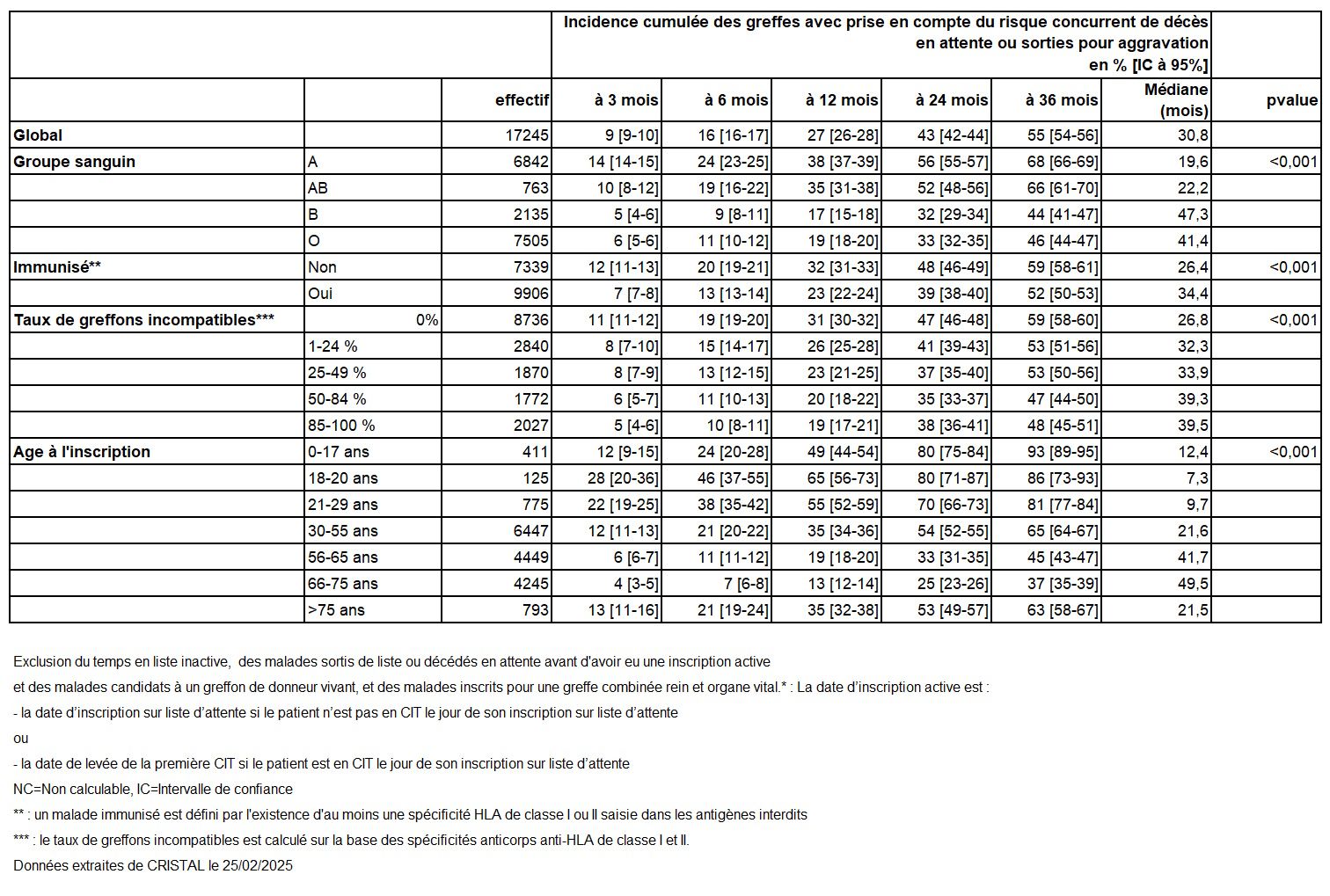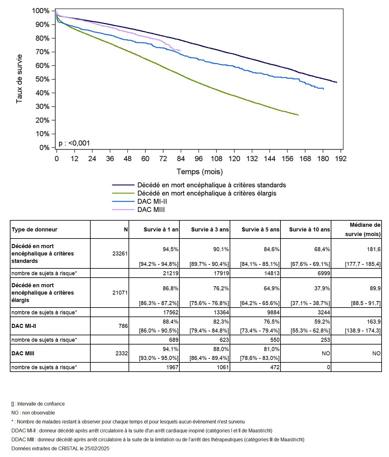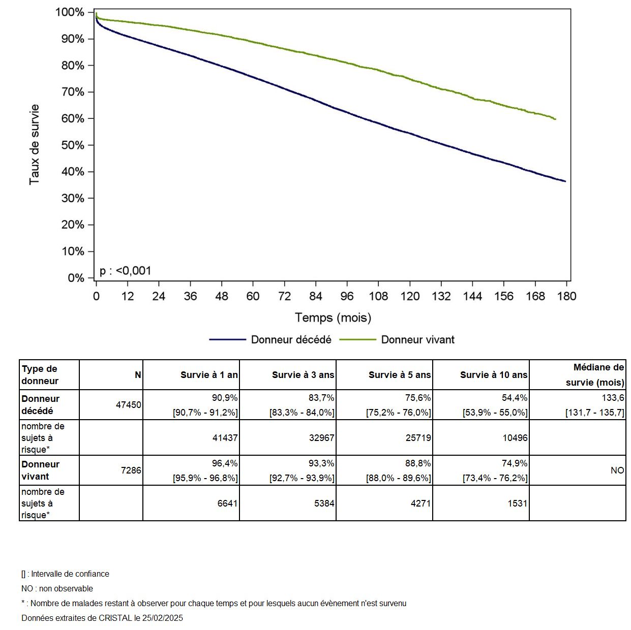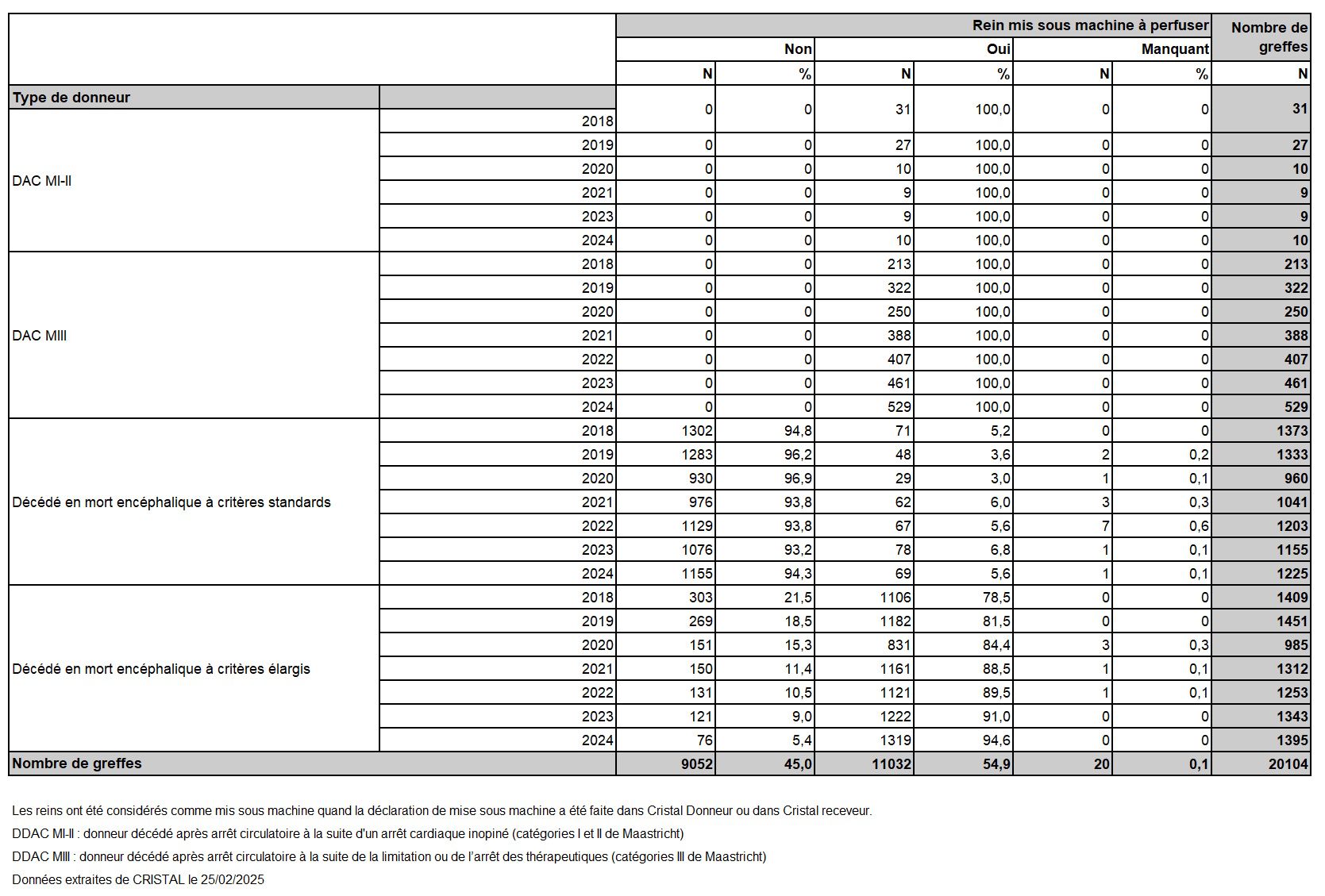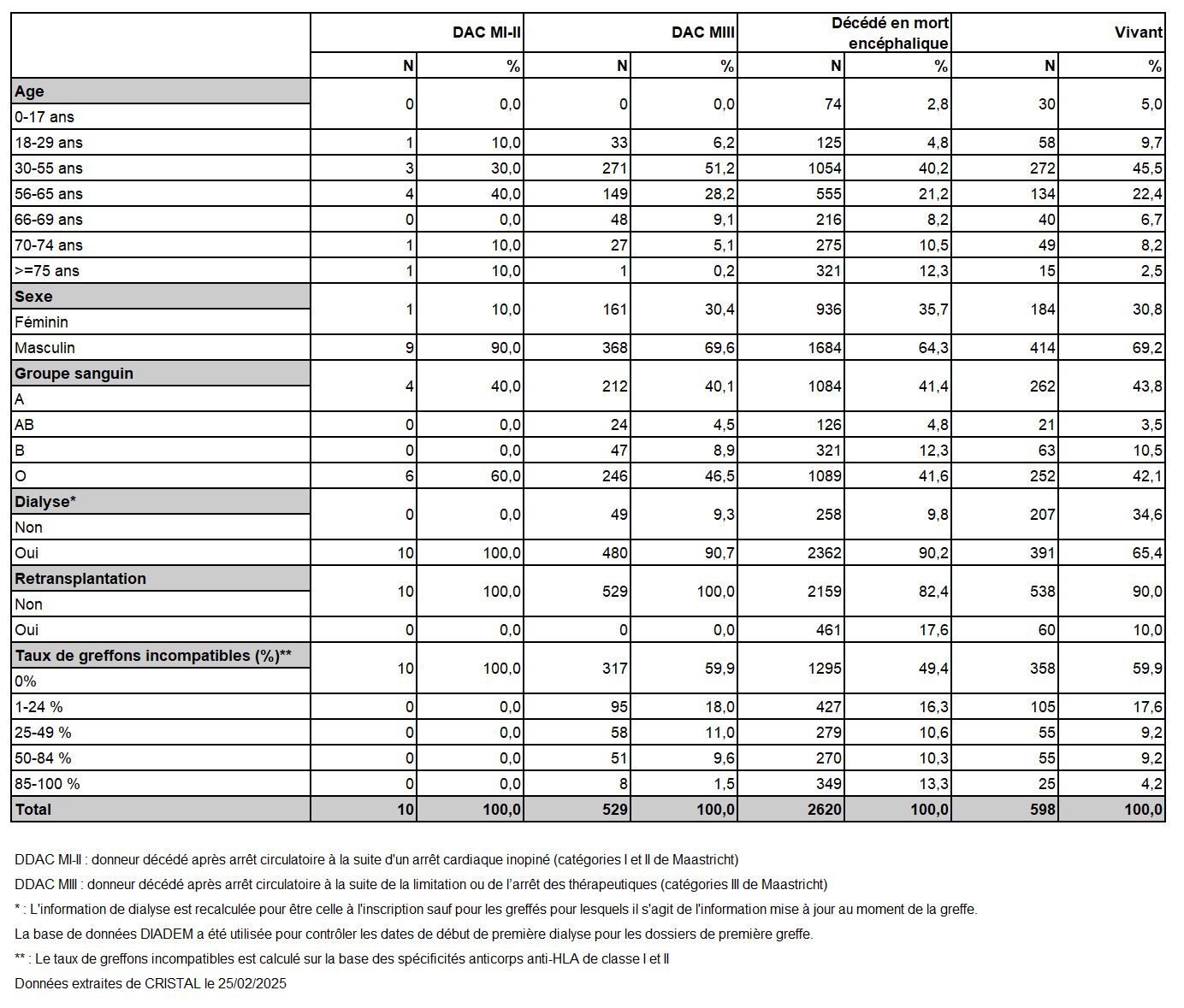 Les greffes suivantes sont exclues des analyses : greffes à partir de donneur vivant et de donneur décédé après arrêt circulatoire, greffes à partir de donneur étranger, greffes combinées, greffes effectuées par des équipes présentant 20% ou plus de perdus de vue.