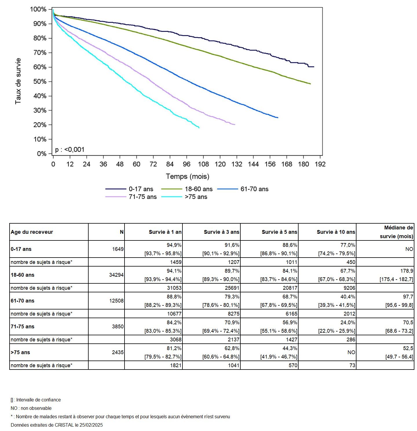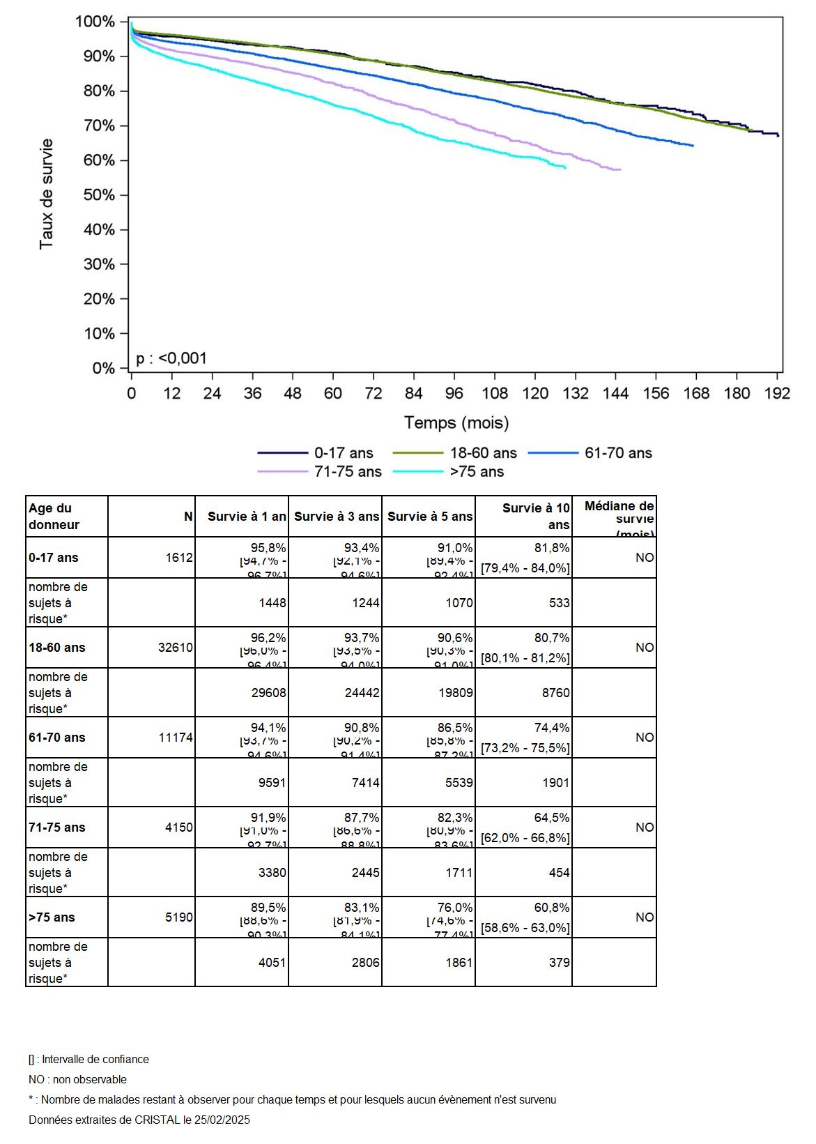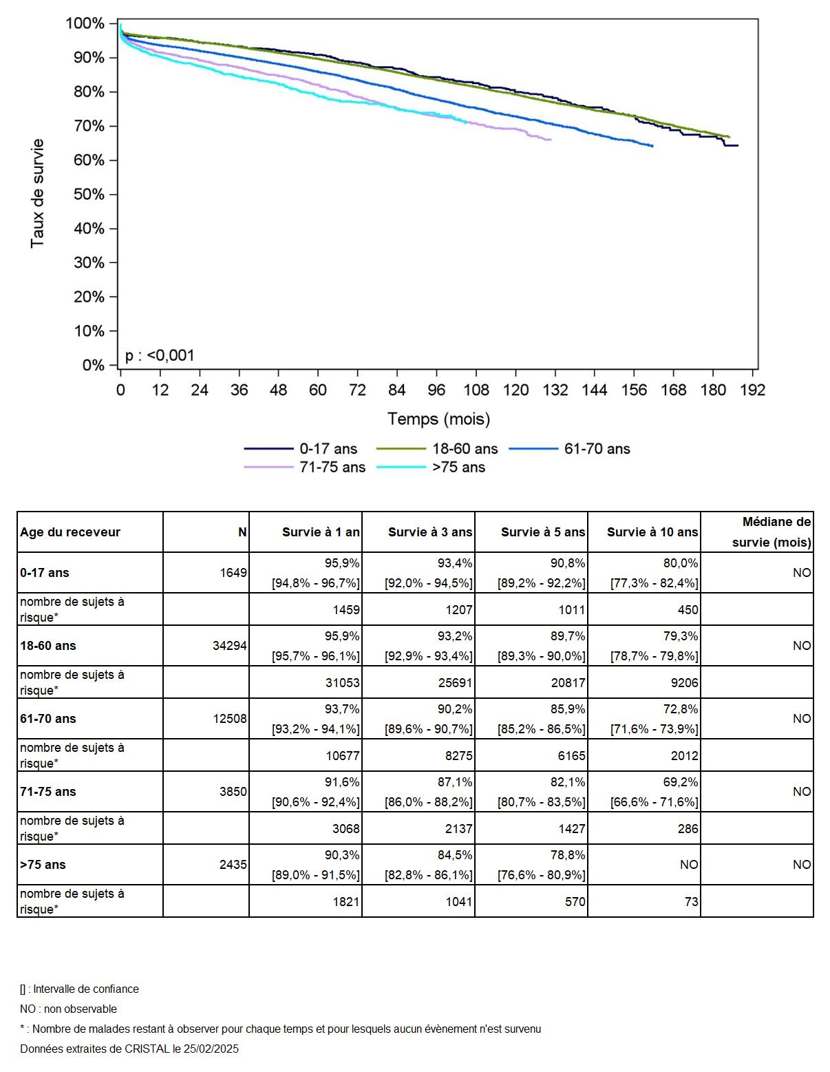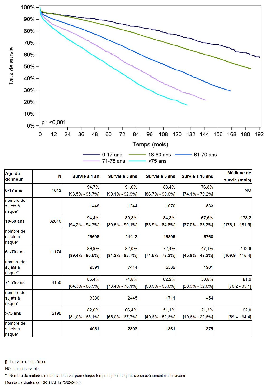 Les greffes suivantes sont exclues des analyses : greffes à partir de donneur vivant et de donneur décédé après arrêt circulatoire, greffes à partir de donneur étranger, greffes combinées, greffes effectuées par des équipes présentant 20% ou plus de perdus de vue.
