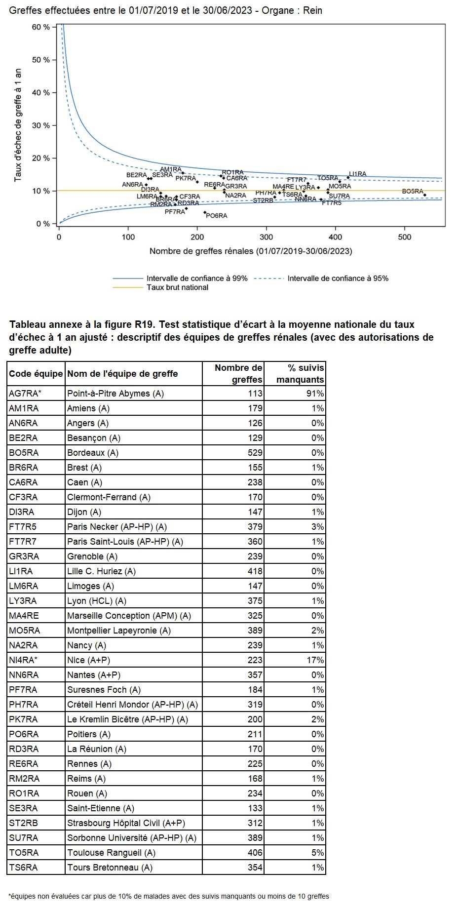 Cette année, aucune équipe a un taux d’échec de greffe à 1 an significativement supérieur à la moyenne nationale et 2 équipes ont un taux d’échec de greffe à 1 an significativement inférieur à la moyenne nationale (Figure R19).