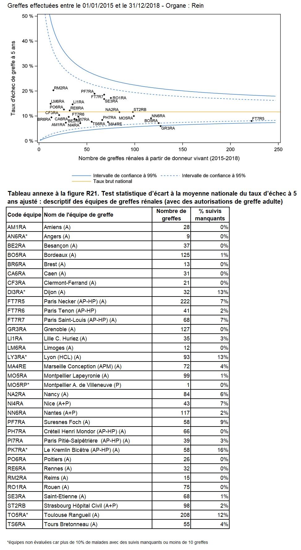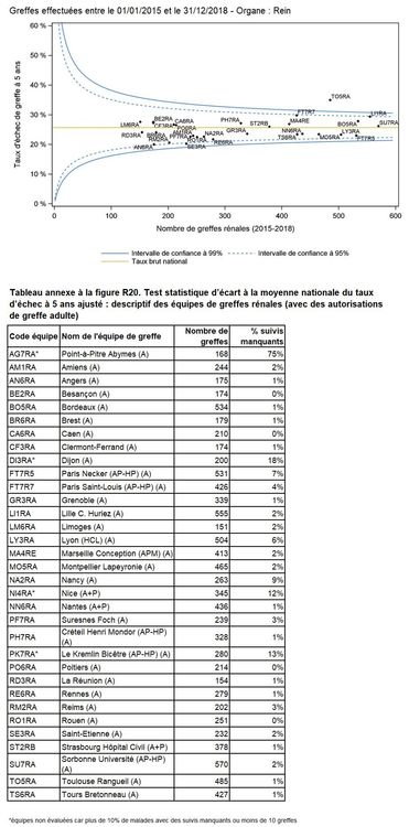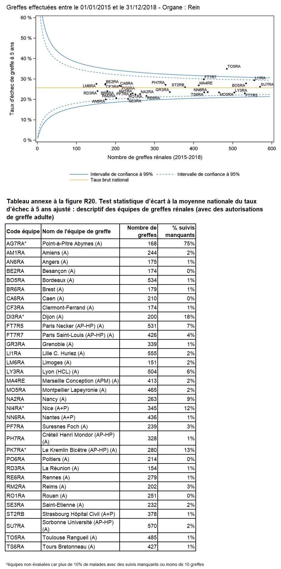 Cette année, 1 équipe a un taux d’échec de greffe à 5 ans significativement supérieur à la moyenne nationale et aucune équipe a un taux d’échec de greffe à 5 ans significativement inférieur à la moyenne nationale (Figure R20).