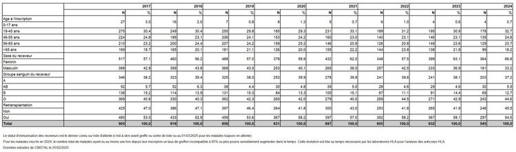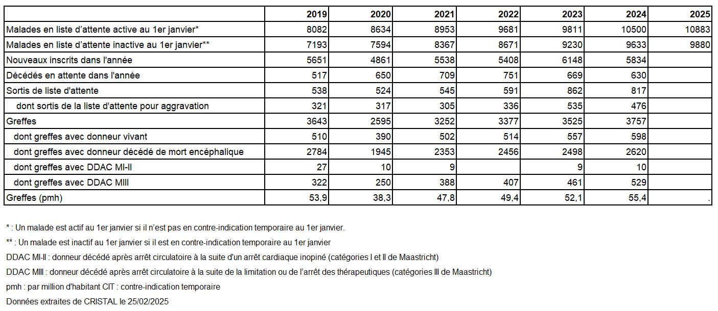 L’année 2024 est marquée par une moindre inscription de nouveaux malades (-5,1%) par rapport à 2023 mais la pénurie perdure et l’on observe une progression du nombre de malades en liste d’attente pour atteindre 10 883 malades en liste d’attente active au 1ier janvier 2025 (+3,6%). Les décès ou sortis de liste pour aggravation sont en recul (-8,1%) par rapport à 2023.