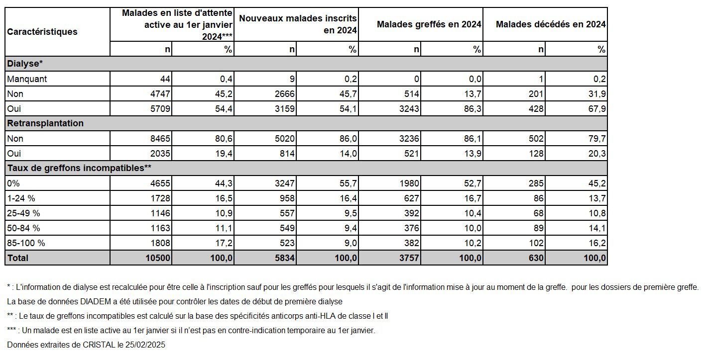 Tableau R3. Caractéristiques démographiques des donneurs de rein et des malades inscrits selon leur devenir en liste d'attente de greffe rénale en 2024