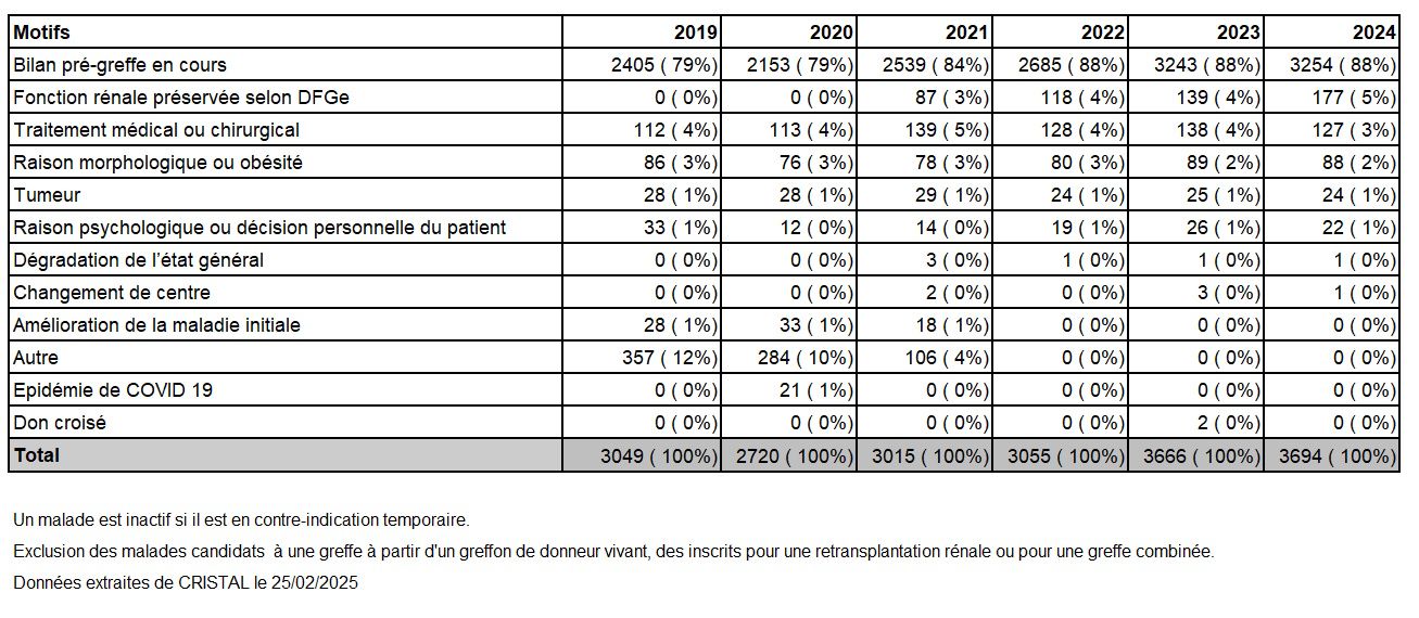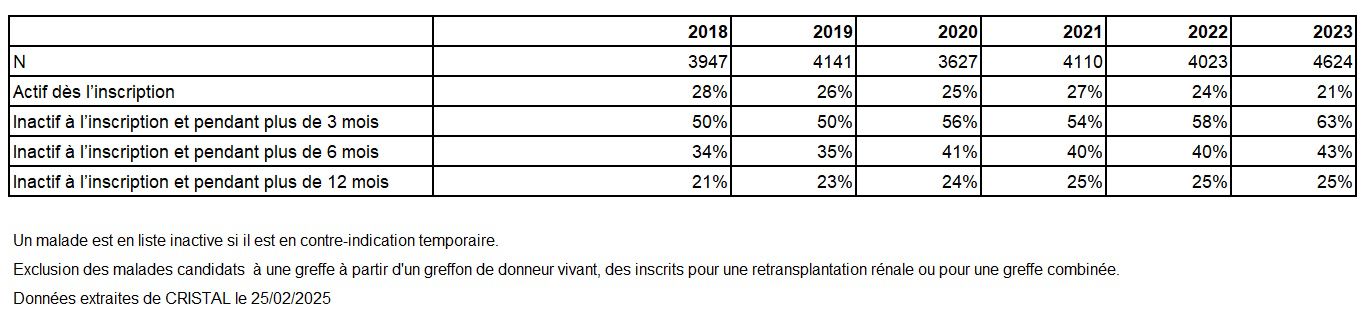 Progressivement le taux d’inscription d’emblée en liste active diminue (21% des nouveaux inscrits pour la première fois en 2023 contre 28% en 2018) et la période d’inactivité se prolonge plus souvent au-delà de 6 mois (43% des nouveaux inscrits pour la première fois en 2023 contre 34% en 2018) avec pour motif dans 88% des cas le bilan pré-greffe en cours (Tableaux R9 et R10).