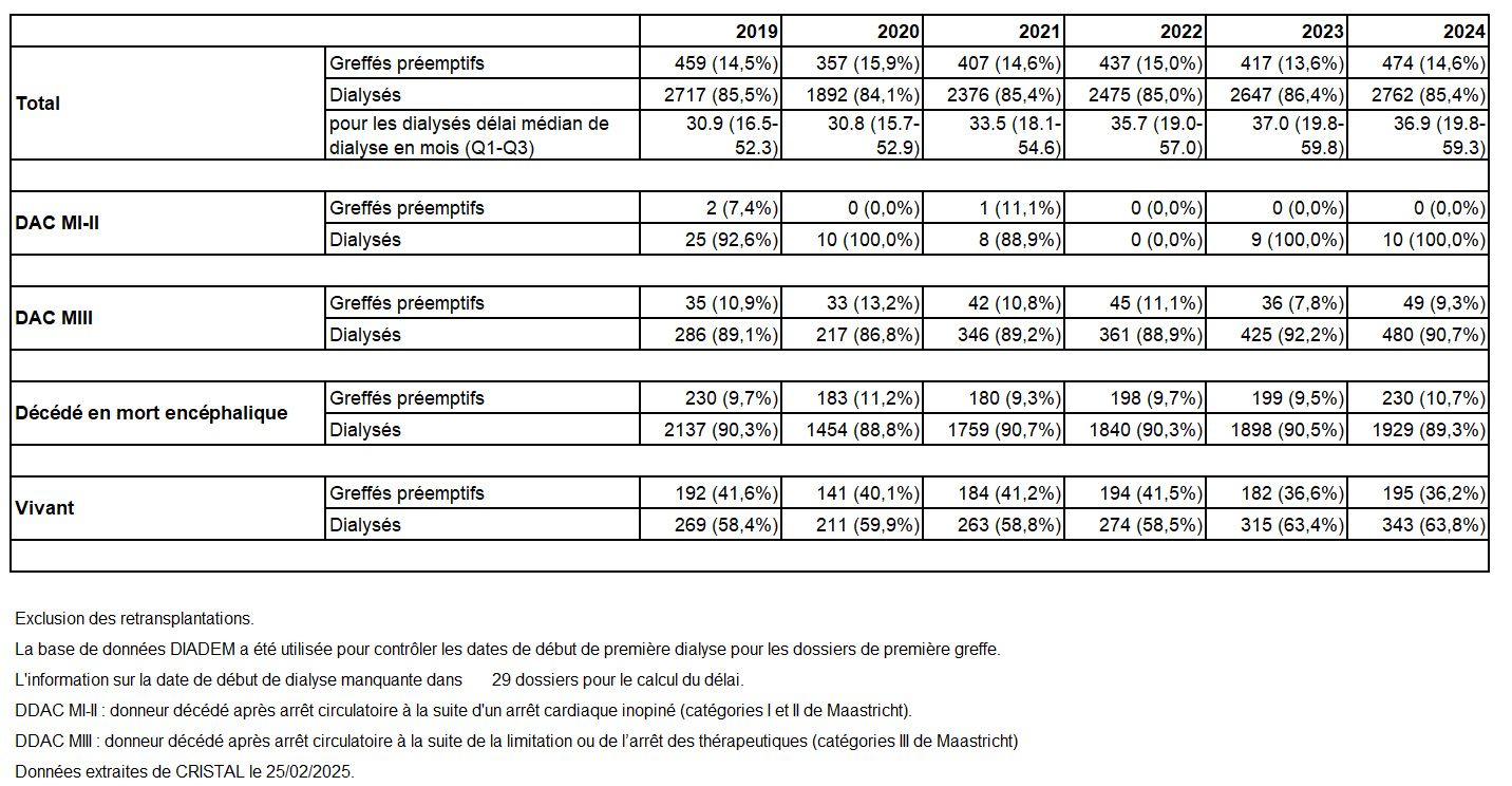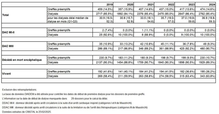 La proportion des greffes réalisées de manière préemptive (hors retransplantation) est relativement stable (14,6%) depuis 2019 et représente respectivement 10,7% et 36,2% des greffes issues de donneurs décédés en mort encéphalique et des donneurs vivants en 2024 (Tableau R21). Pour les malades dialysés ayant reçu une greffe rénale (hors retransplantation) en 2024, la médiane de durée de dialyse s’élève à 36,9 mois contre 30,9 mois avant la crise sanitaire (2019).