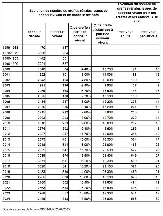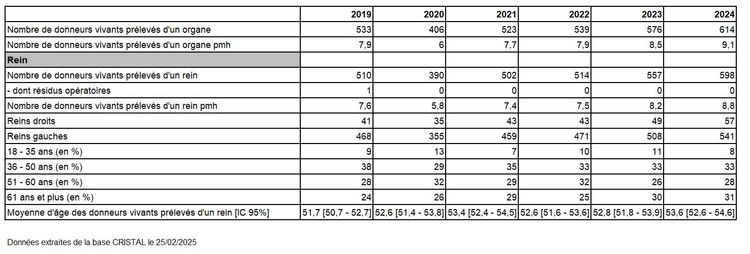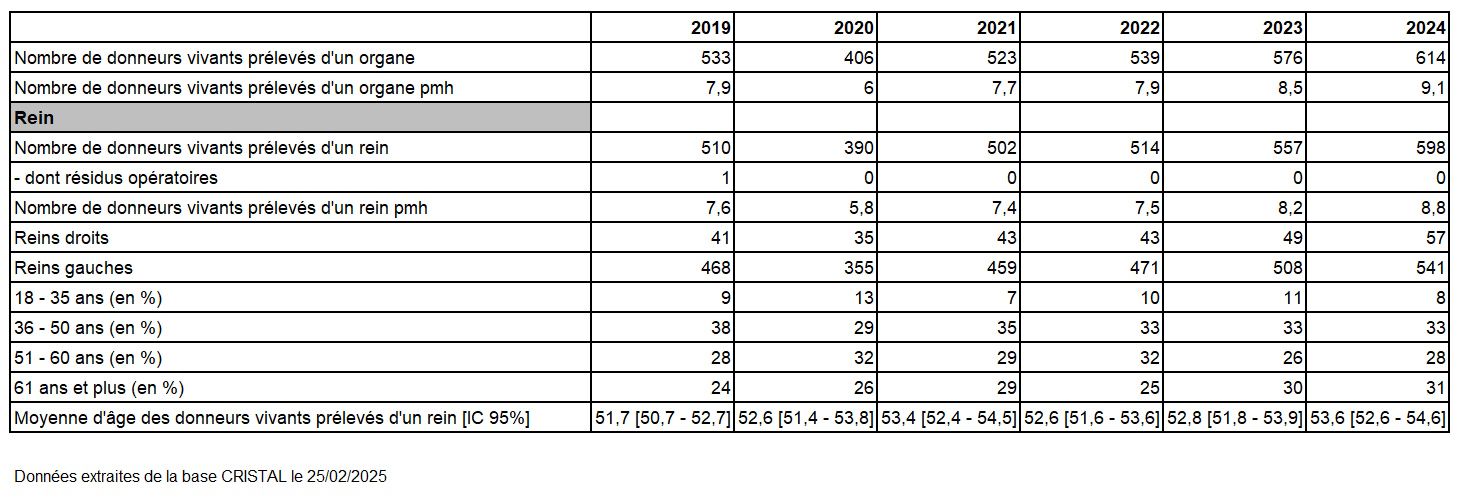 15,9% de donneurs vivants soit 598 greffes (8,8 pmh) (+ 7,4% par rapport à 2023 soit + 41 greffes en 2024). Depuis 1959, le nombre des 10 000 greffes rénales à partir de donneurs vivants a été dépassé courant l’année 2024 !