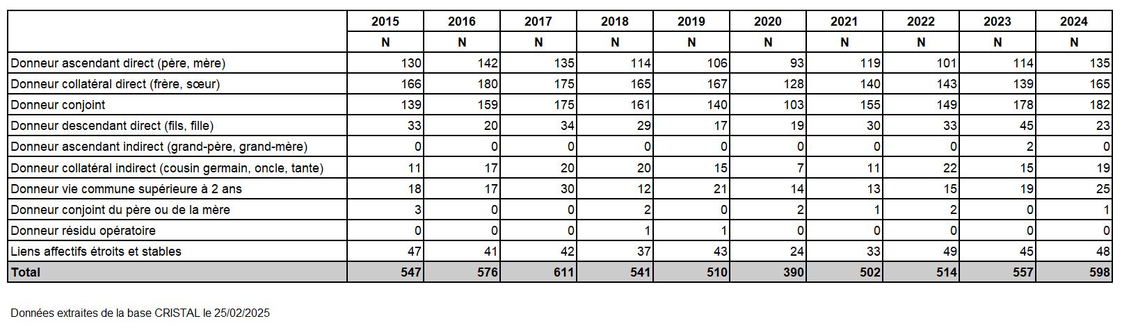Malgré un nombre de paires inscrites dans le programme de don croisé qui reste faible (25 paires au 31/12/2024), 6 greffes de donneurs vivants compatibles ont été réalisées en 2024 via ce programme, avec pour la 1ière fois des échanges impliquant 3 paires.