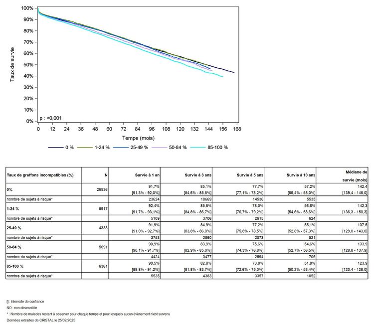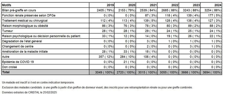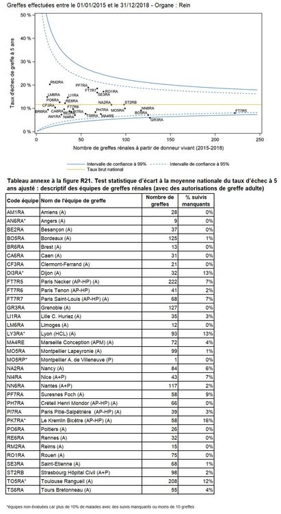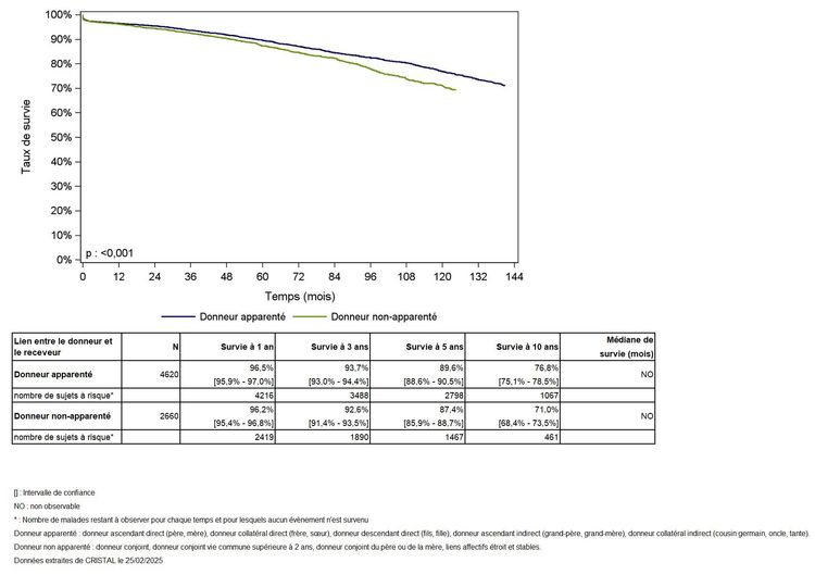 Les greffes suivantes sont exclues des analyses : greffes à partir de donneur décédé, greffes à partir de donneur étranger, greffes combinées, greffes effectuées par des équipes présentant 25% ou plus de perdus de vue.