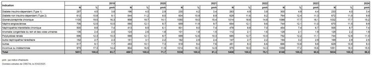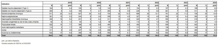 Tableau R5. Evolution du nombre de nouveaux inscrits en attente d'une greffe rénale selon la néphropathie d'origine