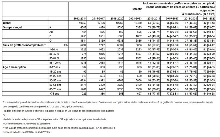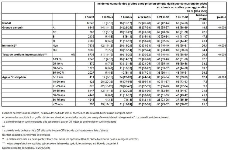 Tableau R13. Evolution de l'Incidence cumulée des greffes avec prise en compte du risque concurrent de décès en attente ou sorties pour aggravation selon les caractéristiques des malades