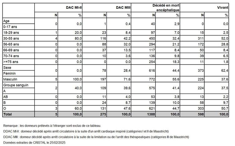 14,3% de donneurs décédés après arrêt circulatoire de la catégorie II ou III de Maastricht soit 539 greffes (+14,7% par rapport à 2023 soit + 69 greffes)