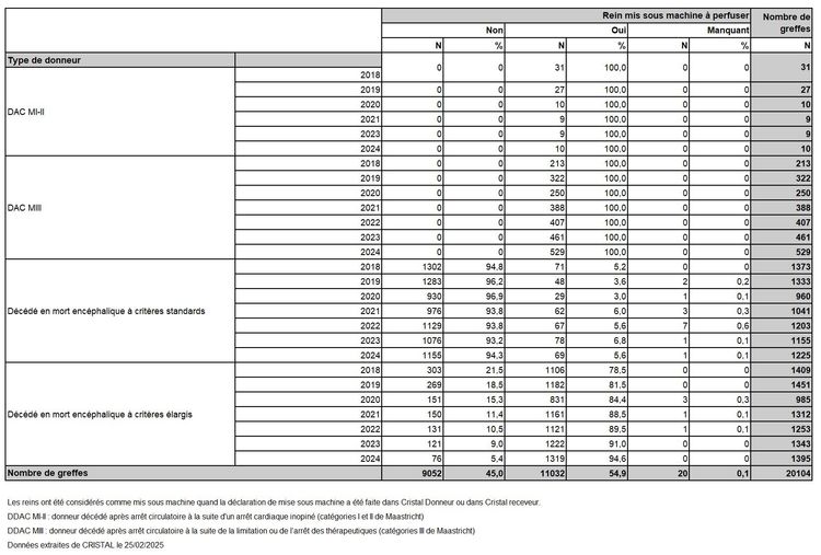Parmi les greffes avec donneurs en mort encéphalique, la proportion de celles dont le donneur est à critères élargis dépasse 50% depuis 2018 (53% en 2024). La mise sous machine à perfusion permet de réduire la non fonction primaire et la reprise retardée de la fonction rénale de ces greffons. En lien avec le plan greffe 2022-26 d’aide au financement de ces machines, le taux de mise sous machine à perfusion de ces greffons à critères élargis progresse pour atteindre 94,6% en 2024 (88,5% en 2021) (Tableau R27). La diminution de la durée moyenne de l’ischémie froide se poursuit en 2024 à 14,1 heures et 12,2 heures si on restreint aux greffes locales (contre 15,1 et 13,2 heures respectivement en 2021) (Tableau R24). La durée moyenne d’ischémie froide pour les greffes issues des donneurs décédés après arrêt circulatoire de la catégorie III de Maastricht est stable à 10,0 heures en 2024 (Tableau R25)