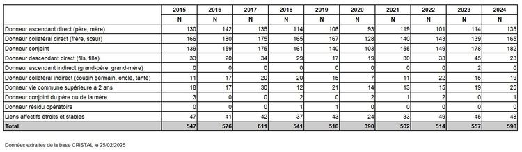 La moyenne d’âge des donneurs vivants s’élève à 53,6 ans en 2024 ; les donneurs de plus de 61 ans sont en progression et représentent 31% des donneurs vivants en 2024 (contre 21% en 2017) (Tableau R33). La première source de donneurs vivants est représentée depuis 4 ans par les conjoints (30,4%) mais la progression en 2024 touche essentiellement la fratrie (27,6%), suivie par les parents (22,6%) (Tableau R36).