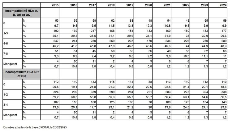Tableau R22. Caractéristiques des greffes en 2024 selon la compatibilité HLA en super-type