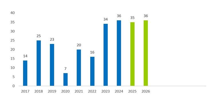 Figure 1 Nombre d'audits de l’activité de prélèvement d’organes et de tissus réalisés et programmés par l’Agence de la biomédecine (2017-2026)