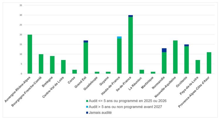 Figure 2 Nombre d’établissements autorisés au prélèvement d’organes et de tissus ou tissus seuls, par région administrative, ayant bénéficié d’un audit datant de moins de 5 ans ou programmés en 2025 ou 2026.