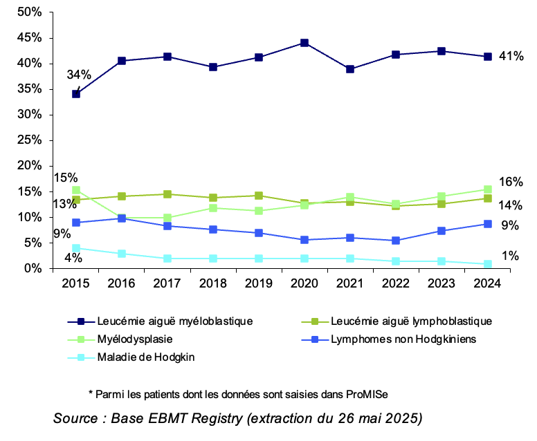- Les allogreffes haplo-identiques, effectuées à partir de donneurs familiaux HLA semi-identiques (22 %), offrant ainsi aux cliniciens un éventail de stratégies thérapeutiques adaptées à l'âge des patients, à leur pathologie et au stade de leur maladie.